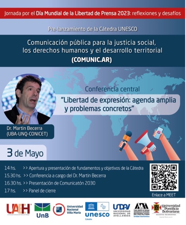 La presentación oficial de la Cátedra se realizó el 3 de mayo de 2023, en formato virtual, con motivo de la celebración del 30° Aniversario del Día Mundial de la Libertad de Prensa, instituido por Naciones Unidas en 1993. En la oportunidad, el investigador argentino Martín Becerra dictó una conferencia sobre “Libertad de expresión: agenda amplia y problemas concretos”, colocando en relieve una de las principales preocupaciones en el estudio de la comunicación pública.