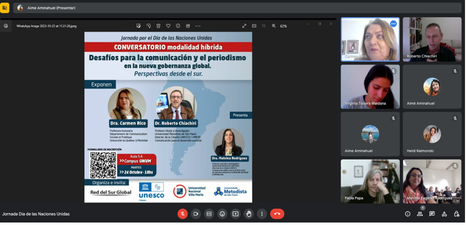 El 24 de octubre de 2023, la Cátedra junto a la Red Perspectivas del Sur Global, realizaron un Conversatorio por el Día de las Naciones Unidas, bajo el título “Desafíos para la comunicación y el periodismo en la nueva gobernanza global. Perspectivas desde el sur”, con la participación de la Dra. Carmen Rico, Profesora honoraria, Département de Communication Sociale et Publique, Université du Québec à Montréal y el Prof. Dr. Roberto CHIACHIRI, Profesor titular e investigador Universidad Metodista de São Paulo, Director de la Cátedra UNESCO / UMESP de Comunicación para el desarrollo regional. Presentó a la Dra. Malvina Rodríguez, Profesora asociada e investigadora Universidad Nacional de Villa María y Directora de la Cátedra UNESCO Comunicación pública para la justicia social, los derechos humanos y el desarrollo territorial (COMUNIC.AR). El evento se desarrolló en modalidad híbrida desde el Campus UNVM y por Plataforma Meet.