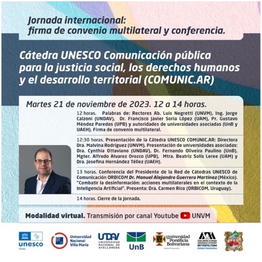 Y finalmente, a fin de llevar a cabo actividades de formación, extensión, investigación, cooperación internacional y alfabetización comunicacional desde la Cátedra UNESCO COMUNIC.AR, la UNVM suscribe convenios marco y actas acuerdo con diversas instituciones locales, nacionales e internacionales. En tal sentido, el 28 de julio de 2023 se firmó un convenio marco con el Instituto de Educación Superior Castagnino de Ucacha, Pcia. de Córdoba. El 22 de noviembre del mismo año, se realizó la Jornada internacional, conferencia y firma de convenio multilateral con Red Internacional Asociada a la Cátedra UNESCO COMUNIC.AR, integrada por una Universidad asociada de Argentina, la Universidad Nacional de Avellaneda (UNDAV) y una red internacional integrada por las siguientes universidades: Universidad Autónoma del Estado de Hidalgo (UAEH-México), Universidad Autónoma Metropolitana Unidad Xochimilco (UAM-México), Universidad Pontificia Bolivariana, sede Bucaramanga (UPB-Colombia) y Universidad de Brasilia (UB-Brasil). En la Jornada, presidida por el Rector de la UNVM, Luis Negretti, participaron Rectores, autoridades y representantes de las Universidades participantes de la Red. El presidente de ORBICOM, Dr. Manuel Alejandro Guerrero Martínez, dictó la Conferencia “Combatir la desinformación: acciones multilaterales en el contexto de la Inteligencia Artificial”. Durante 2024 se encuentran a la firma un convenio marco, ya aprobado por el Consejo Superior de la UNVM, con la Universidad Blas Pascal de la ciudad de Córdoba y un Acta Acuerdo con la Municipalidad de Villa María, a fin de fortalecer la cooperación con el Programa UNESCO “Villa María, Ciudad del Aprendizaje”.